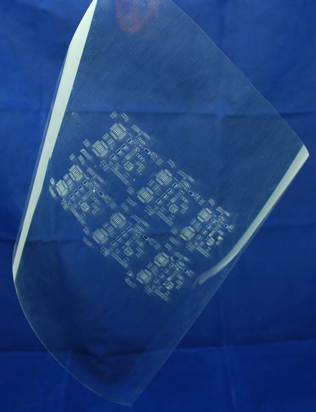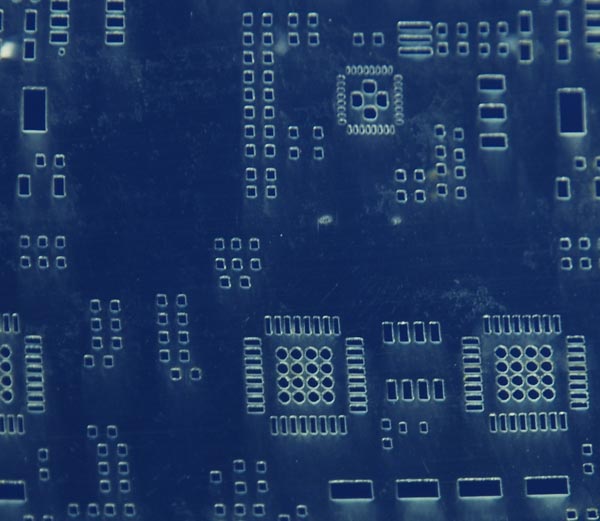 Close-up of a mylar solder paste stencil (the mylar is not stretched flat, making the apertures look distorted). |