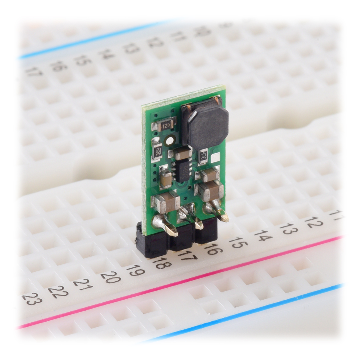 This compact (0.32″×0.515″) switching step-up (or boost) voltage regulator efficiently generates 12 V from input voltages as low as 1.3 V and handles continuous input currents up to around 1.5 A. (Note: minimum start-up voltage is 2.7 V, but it operates down to 1.3 V after that.) The pins have a 0.1″ spacing, making this board compatible with standard solderless breadboards and perfboards.