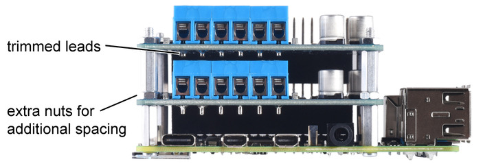 Two Motoron M2H boards with terminal blocks can be stacked if you trim the leads on the terminal blocks and space out each board using hex nuts in addition to the 11mm standoffs. |