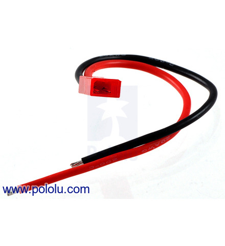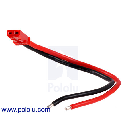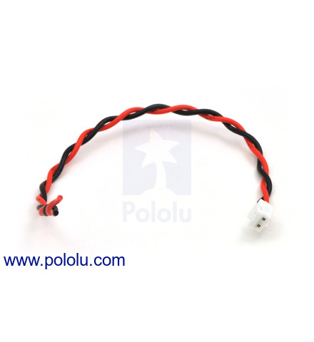 This 5.5" (14cm) cable has two 26AWG conductors with a 2mm-pitch 2-pin female JST PH-style connector. The other ends of the wires are unterminated; they can be cut to length to match your application. The red and black wires are twisted together to reduce noise.