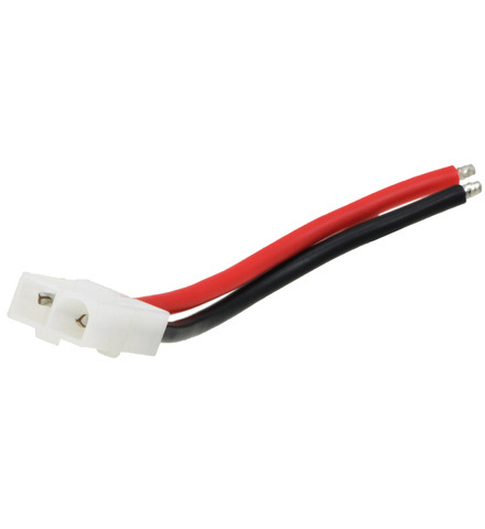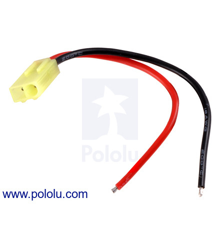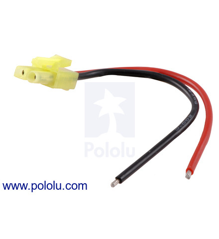 This connector, a smaller version of the female Tamiya plug, is commonly used with battery packs for RC applications. The connector is keyed so that power cannot be reversed, and a latch secures the connection so that it will not become disconnected. This female mini Tamiya connector has 10 cm 18-AWG leads with stripped and tinned terminations.