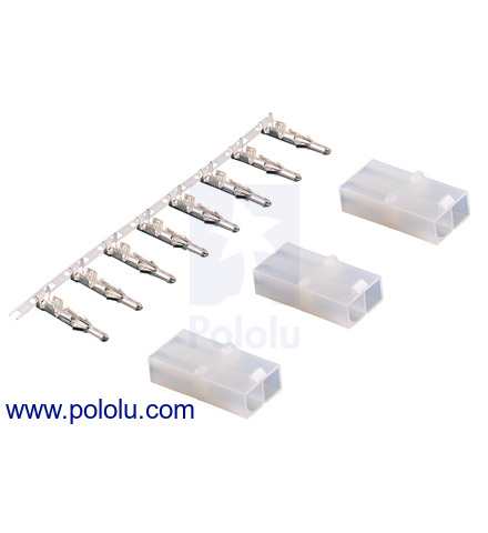 This style of high-current connector is commonly used with the 7.2V sub-C battery packs that power many RC cars. The connector is keyed so that power cannot be reversed, and a latch secures the connection so that it will not become disconnected. You can use a crimping tool to attach these connectors to your own 14- to 20-AWG wires. This pack contains enough housings and crimp pins (including two spare pins) for 3 male connectors.