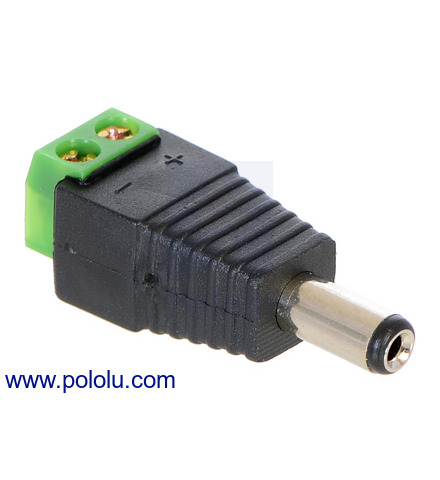 This connector adapts a 5.5 × 2.1 mm DC barrel jack to a pair of screw terminals spaced approximately 5 mm (0.2″) apart. The terminals are labeled positive and negative, with the positive terminal connected to the center pin.
