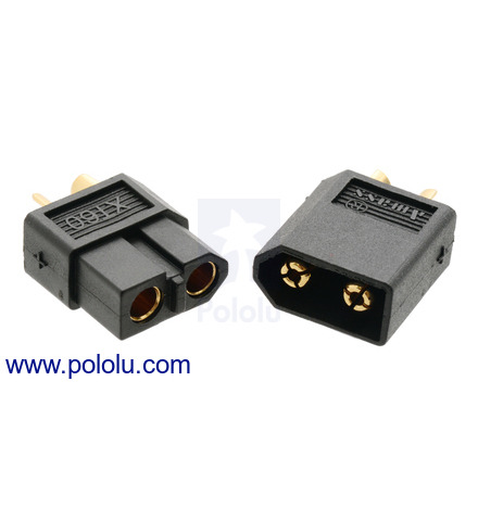 These are generic connectors similar to the popular Deans Ultra Plug connectors. They are sold as matching male-female pairs and have a current rating of 50 A. They are the smallest high-current connectors we know of, and they are great for projects that involve bigger motors and controllers, such as our Simple Motor Controllers and high-power motor drivers.
