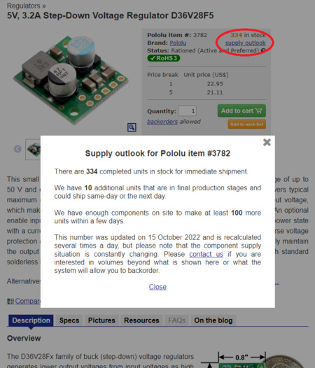 Wow, it’s been almost a year since my last update about how Pololu has been impacted by the global supply chain disruptions and chip shortages. And unfortunately, not much has improved. In today’s post, I will cover a few representative component stock histories and then go over other areas of our business that have been impacted and what we are doing to get through this situation.