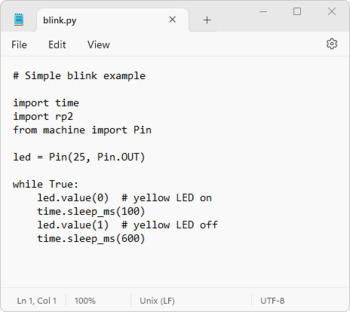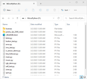 That brings us to the new 3pi+ 2040, powered by the Raspberry Pi RP2040 microcontroller (32-bit dual-core Arm Cortex-M0+) with 16 MB (128 Mbit) of flash memory. The robot ships preloaded with a MicroPython interpreter, so you can get started right away by plugging into its USB C port and editing the included example Python programs with your favorite text editor. No special programmers or programming software are required, and you can write MicroPython code from practically any desktop or mobile operating system as long as it has a text editor and the ability to copy files to a USB drive. For a basic Python IDE that lets you run code interactively, we are recommending the Mu editor. (See the User’s Guide for instructions on setting it up.)