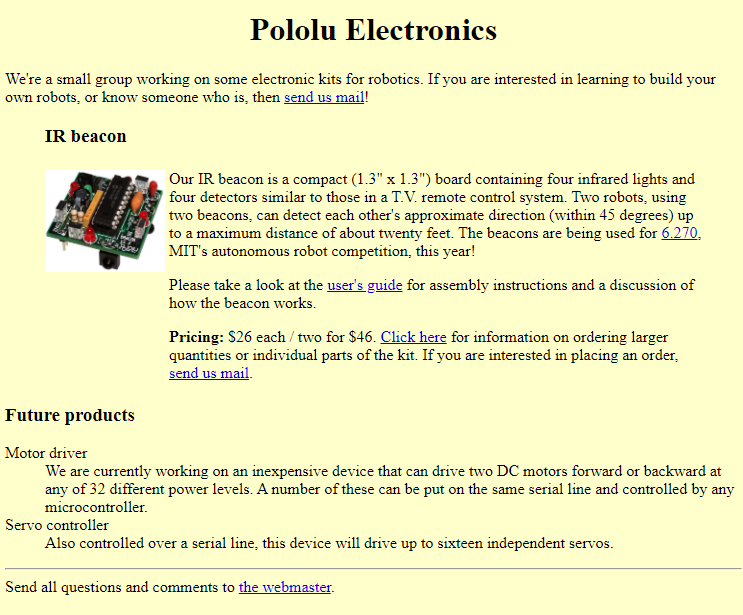 The picture on the right shows Paul’s and my initials on the back side of that PCB design, and Paul registered the pololu.com domain on November 18, 2000. Here is a reconstruction, based on the Internet Archive, of how the Pololu web site probably looked in February 2001: