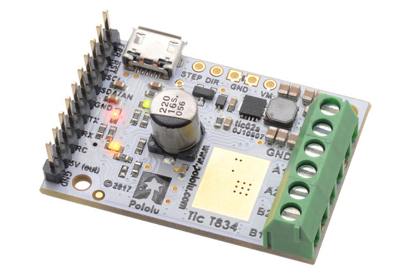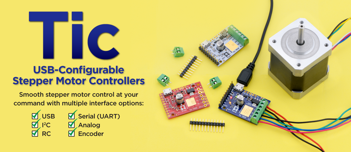 The Tic offers simple control of bipolar stepper motors directly from a variety of interfaces, including USB, TTL serial, I²C, hobby radio control (RC), analog voltage (potentiometer), and quadrature encoder signals.