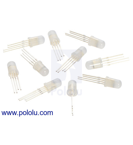 This 10-pack of 8 mm through-hole RGB LEDs offers an easy way to add colorful and complex lighting effects to a project. Each diffused LED features an integrated WS2811 driver that operates at 5 V and is controlled through a high-speed one-wire digital interface that allows multiple LEDs to be connected together to form a chain of addressable RGB LEDs.