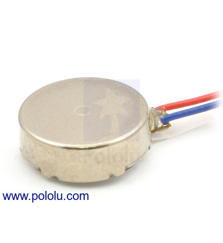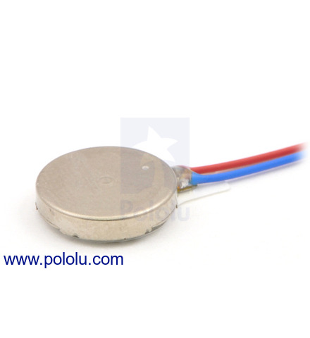 This tiny, button-type, vibrating motor shakes with a vibration amplitude of 0.75g and draws approximately 60 mA when 3 V is applied to its leads. The shaftless design keeps this motor small: 10 mm in diameter and 3.4 mm in height.