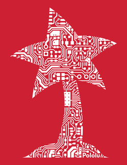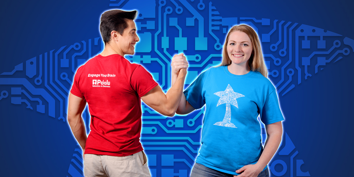 These pre-shrunk cotton T-shirts feature the Pololu logo, composed of a white printed circuit board (PCB) layout, on the front and the phrase “Engage Your Brain” on the back. They are available in a variety of sizes and three colors: black, sapphire blue, and cardinal red.