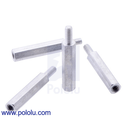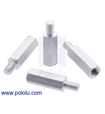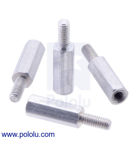 These hexagonal male-female aluminum standoffs are intended specifically for use with the Raspberry Pi. They keep parts spaced 11 mm apart, which is just the right height for mounting expansion boards with standard-size female headers, and they have 4mm-long M2.5 threads that are just the right size for the Raspberry Pi’s mounting holes. These standoffs are sold in packs of 4.