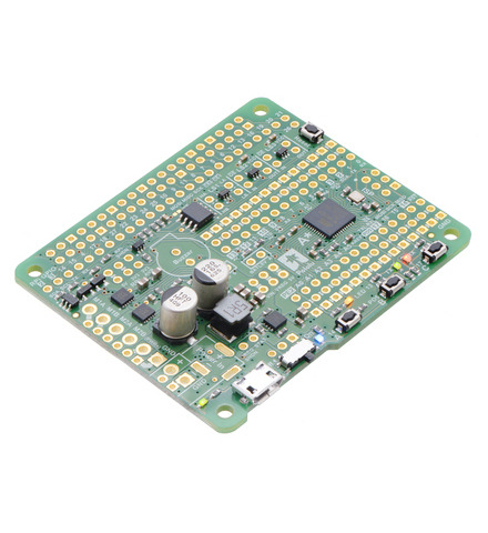 This programmable module combines with a Raspberry Pi to serve as the control center of a small robot or electronics project. Its ATmega32U4 AVR microcontroller comes preloaded with an Arduino-compatible bootloader, and the board includes dual motor drivers that can deliver 1.8 A per channel to two brushed DC motors. An efficient voltage regulator (2.7 V to 11 V input) and level shifters enable it to power and communicate with a Raspberry Pi. This version (item #3117) is assembled with selected through-hole connectors and components installed for use as a Raspberry Pi add-on.