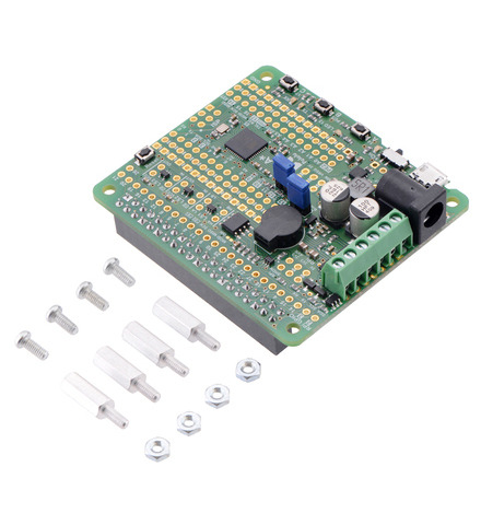 This programmable module combines with a Raspberry Pi to serve as the control center of a small robot or electronics project. Its ATmega32U4 AVR microcontroller comes preloaded with an Arduino-compatible bootloader, and the board includes dual motor drivers that can deliver 1.7 A per channel to two brushed DC motors. An efficient voltage regulator (5.5 V to 36 V input) and level shifters enable it to power and communicate with a Raspberry Pi. This version (item #3119) is assembled with selected through-hole connectors and components installed for use as a Raspberry Pi add-on.