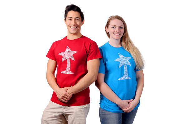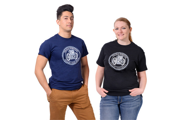 These T-Shirts feature the Pololu logo, composed of a white printed circuit board layout, on the front, and the phrase “Engage Your Brain”, on the back. Various sizes are available in three colors: black, sapphire blue, and cardinal red.