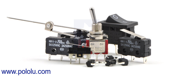 This single-pole, double-throw (SPDT) rocker switch makes a great on/off power switch. It is rated for 10 A at 125 VAC and 6 A at 250 VAC.