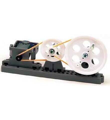 The Tamiya 70121 Pulley Unit Set includes seven pulleys of various sizes, a motor, and mounting parts. This set can be combined with a variety of Tamiya products.