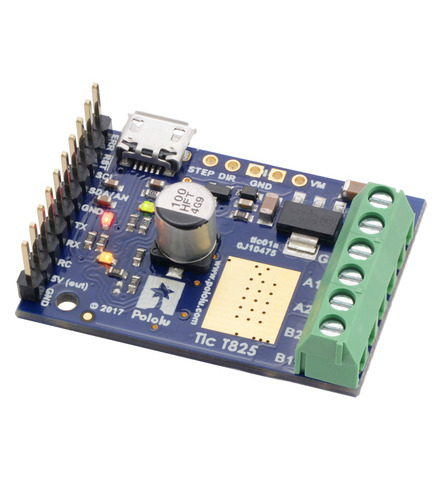 The Tic T825 USB Multi-Interface Stepper Motor Controller makes basic control of a stepper motor easy, with quick configuration over USB using our free software. The controller supports six control interfaces: USB, TTL serial, I²C, analog voltage (potentiometer), quadrature encoder, and hobby radio control (RC). This version incorporates a TI DRV8825 driver and ships with soldered header pins and terminal blocks. It can operate from 8.5 V to 45 V and can deliver up to approximately 1.5 A per phase without a heat sink or forced air flow (or 2.5 A max with sufficient additional cooling).