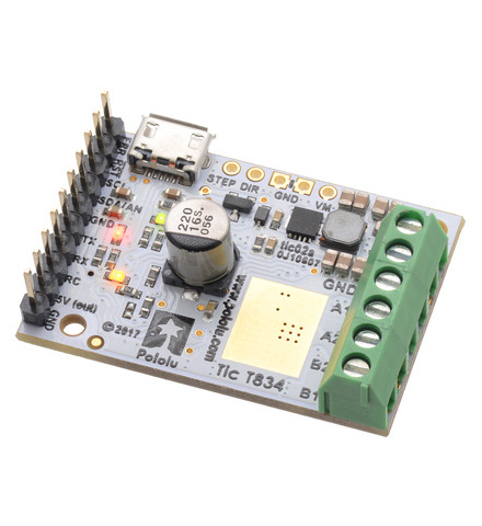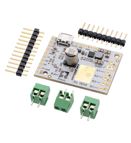 The Tic T834 USB Multi-Interface Stepper Motor Controller makes basic control of a stepper motor easy, with quick configuration over USB using our free software. The controller supports six control interfaces: USB, TTL serial, I²C, analog voltage (potentiometer), quadrature encoder, and hobby radio control (RC). This version incorporates a TI DRV8834 driver, and male headers and terminal blocks are included but not soldered. It can operate from 2.5 V to 10.8 V and can deliver up to approximately 1.5 A per phase without a heat sink or forced air flow (or 2 A max with sufficient additional cooling).