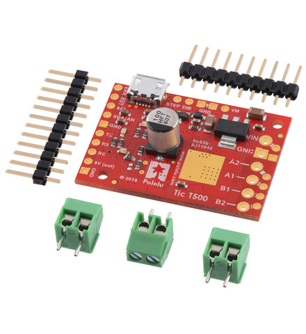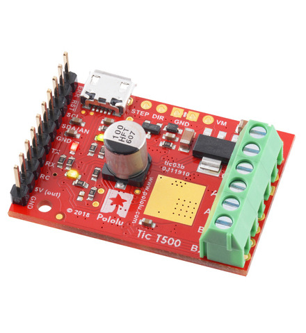 The Tic T500 USB Multi-Interface Stepper Motor Controller makes basic control of a stepper motor easy, with quick configuration over USB using our free software. The controller supports six control interfaces: USB, TTL serial, I²C, analog voltage (potentiometer), quadrature encoder, and hobby radio control (RC). This version incorporates an MPS MP6500 driver and ships with soldered header pins and terminal blocks. It can operate from 4.5 V to 35 V and can deliver up to approximately 1.5 A per phase without a heat sink or forced air flow (or 2.5 A max with sufficient additional cooling).