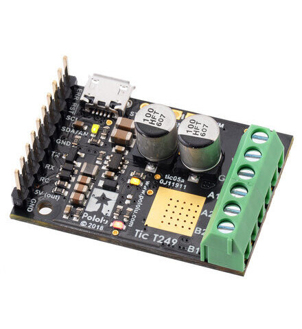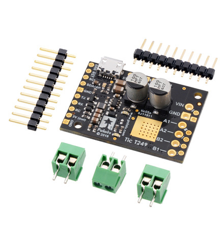The Tic T249 USB Multi-Interface Stepper Motor Controller makes basic control of a stepper motor easy, with quick configuration over USB using our free software. The controller supports six control interfaces: USB, TTL serial, I²C, analog voltage (potentiometer), quadrature encoder, and hobby radio control (RC). This version incorporates a Toshiba TB67S249FTG driver with innovative and unique features that include Automatic Gain Control, and male headers and terminal blocks are included but not soldered. It can operate from 10 V to 47 V and can deliver up to approximately 1.8 A per phase without a heat sink or forced air flow (or 4.5 A max with sufficient additional cooling).