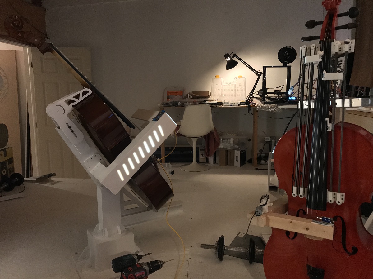 Yes, I designed the whole robotic system from scratch. The cello is such a beautiful instrument in both design and sound. However it is designed specifically for a human body, none of the strings are parallel or in the same plane even, they all diverge towards the bridge. I didn’t want to change the actual instrument in any way for this project. This complicated the build a lot! On top of that, no two instruments are the same, so I had to make sure that the parts could be adjusted in the different planes depending on the instrument they were attached to. Another difficulty is at the top end of the finger board the strings are very close together meaning the sliders all had to be very thin so as not to collide with each other. In the end all these considerations led me to the decision that I would 3D print all the parts. With such a short build timeline, this meant I could design and print revisions of all the parts much quicker than if I was making all the parts by hand in the workshop.