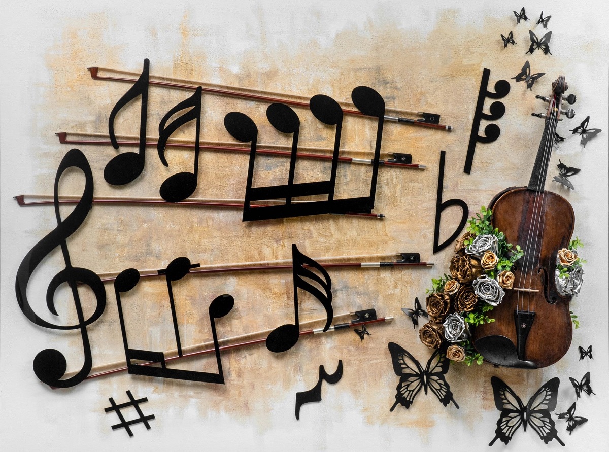 The piano-glossy notes, the authentic violin bows and an actual violin, the laser-cut butterflies, the preserved roses – each element brings a different sensation and a different meaning.