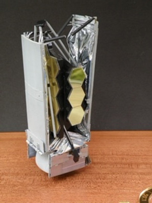 50:1 scale model of the James Web Space Telescope model with laser-cut and etched gold-mirror acrylic and gold-mirror styrene parts. |